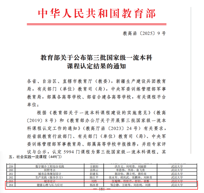 近日,教育部发布《关于公布第三批国家级一流本科课程认定结果的通知》(教高函〔2025〕9号),ag百家乐官网 杨冰香教授负责的《健康心理与压力应对》课程成功认定为国家级一流本科课程(社会实践一流课程),实现ag百家乐官网 在国家级一流本科课程建设方面的新突破。截至目前,学院已获批国家级一流本科课程3门,涵盖线上、线上线下混合及社会实践三种类型,充分体现了学院在课程改革、教学创新和实践育人方面的综合实力。