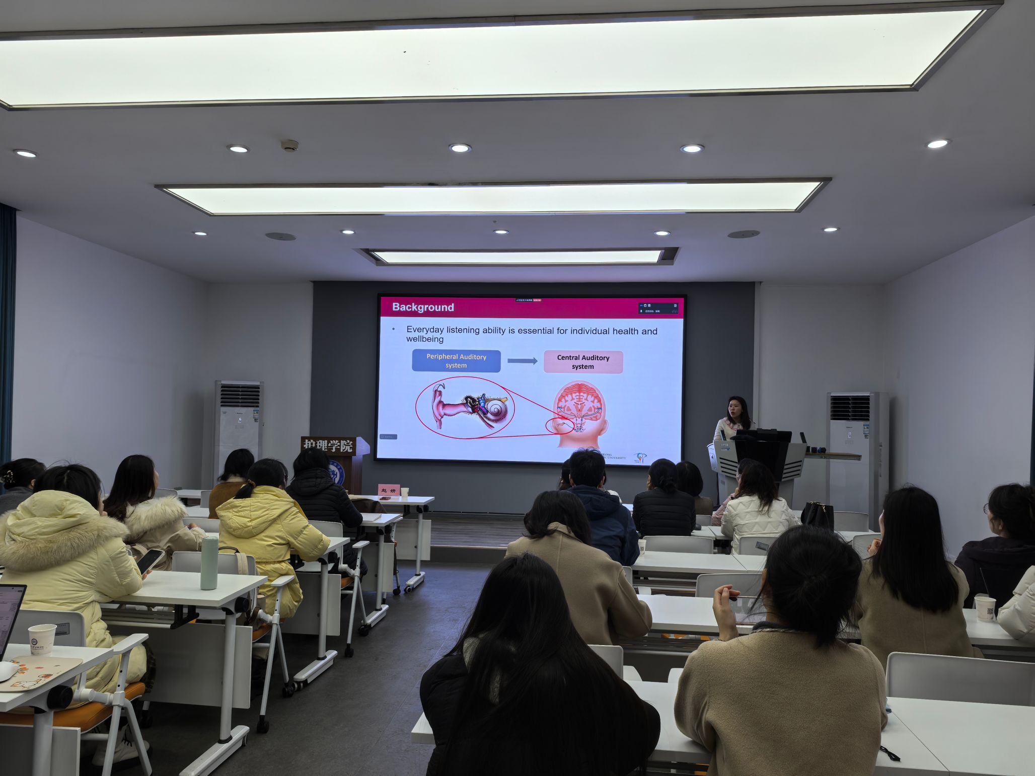 助理教授、世界卫生组织社区健康服务合作中心副主任赵妍博士,以“游戏化听力-认知双任务训练系统(听聪智明)对老年人认知和听力的影响:一项试点随机对照试验”为主题进行学术分享。来自学院和附属医院的护理学科师生参与讲座交流,ag百家乐官网