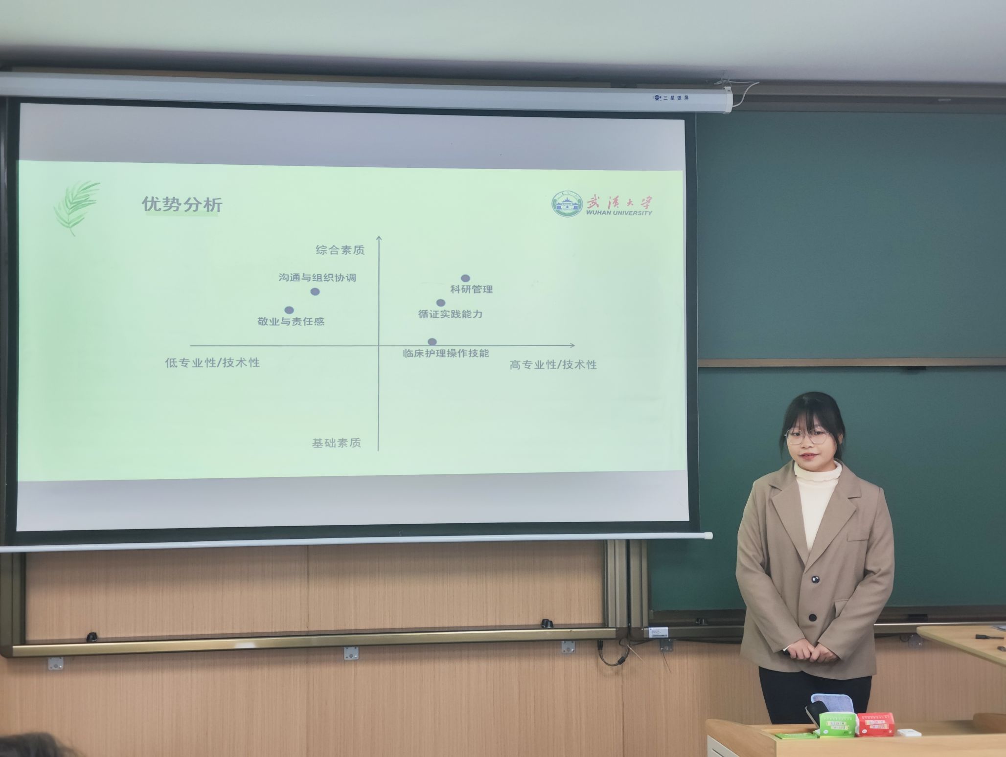 决赛现场,选手们通过PPT展示与答辩,围绕职业目标、发展路径、行业分析及实施计划等核心内容,结合专业特色与个人优势阐述职业规划。有的选手聚焦老年护理,提出“医养结合”社区护理服务创新思路;有的立志成为专科护理专家,规划临床到学术的进阶路径;还有选手着眼护理教育与管理,彰显推动行业高质量发展的远大抱负。选手们逻辑清晰的规划、扎实的专业功底、自信从容的表达赢得了评委的认可与现场观众的阵阵掌声。