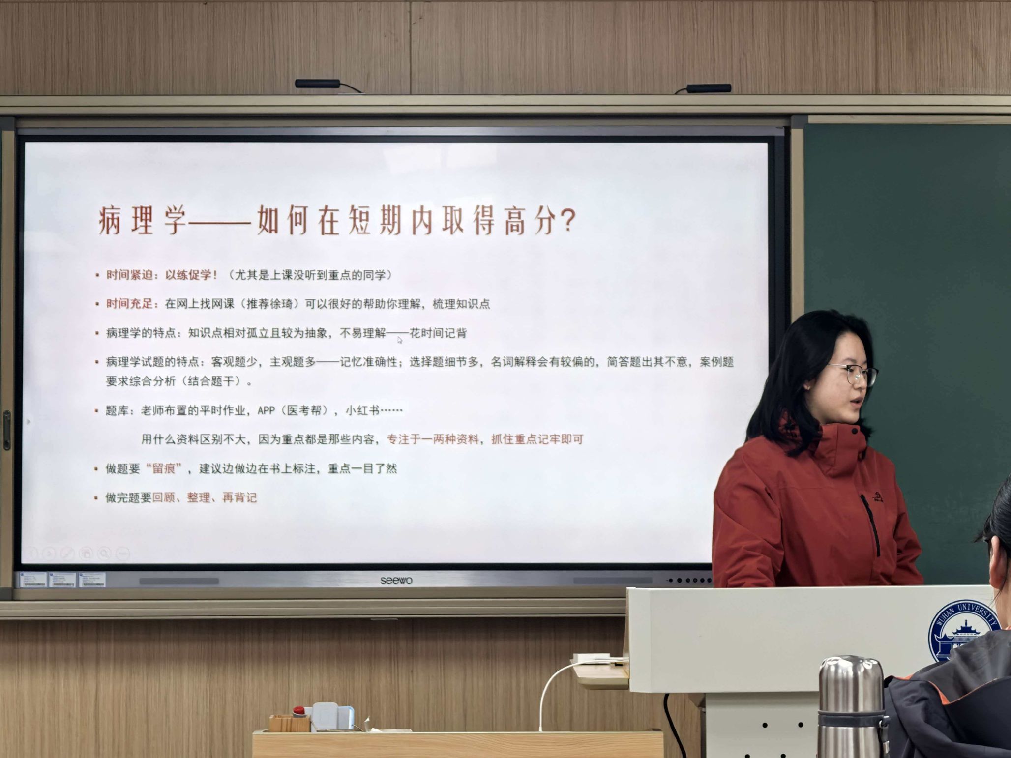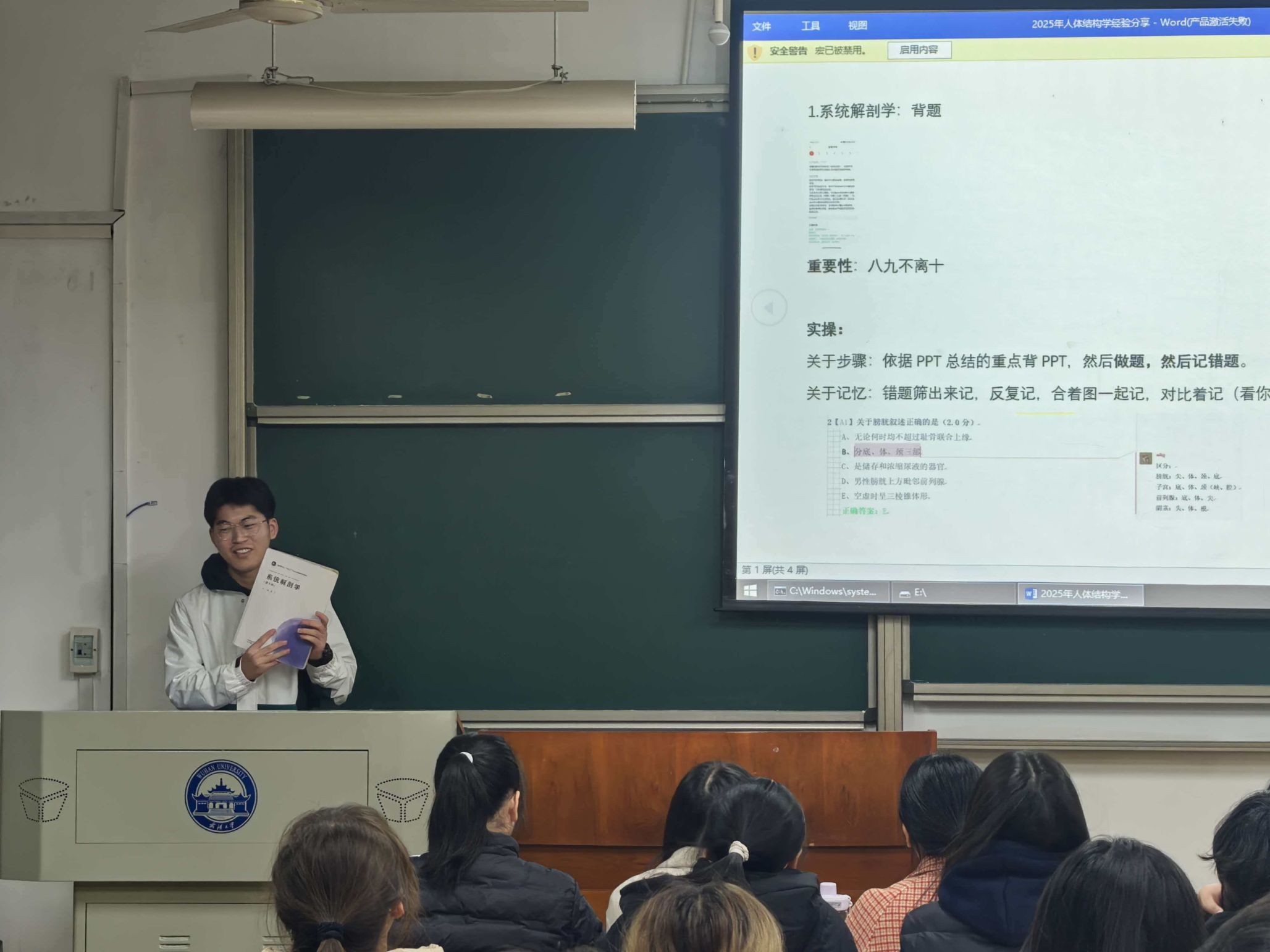 针对2025级本科生在基础医学相关课程中遇到的学习困惑,熊光龙、王梓涵、吴虑等三位学长学姐结合自身备考经历,带来了干货满满的实用技巧分享。他们着重强调,复习需紧扣课堂老师强调的核心重点,合理规划时间、高效推进复习节奏,避免盲目刷题与精力浪费;同时建议同学们善用优质刷题平台,通过针对性练习强化知识应用与实战能力,及时查漏补缺;此外,还推荐借助 AI 工具辅助知识点复盘与梳理,将零散内容系统化、条理化。三位学长学姐更无私分享了自己精心整理的优质学习资料与笔记范本,从方法指导到资源支持全方位助力,帮助同学们明晰学习思路、夯实学科基础,缓解备考焦虑。