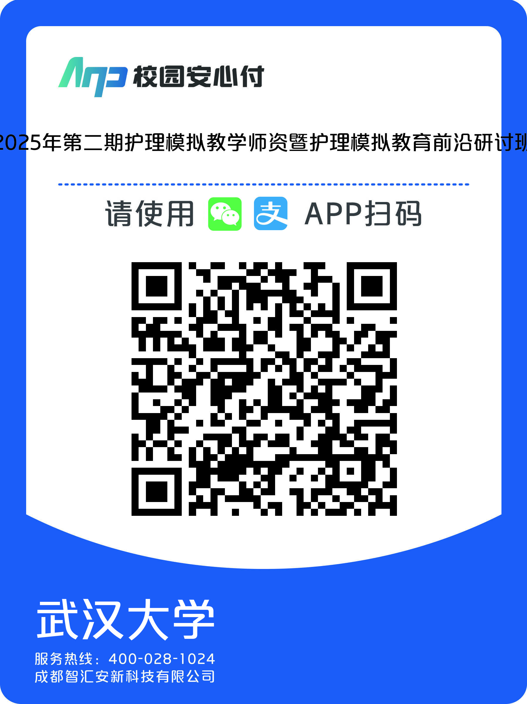 1. 请参训学员扫使用手机微信/支付宝/银联APP扫下方二维码登记报名信息并完成缴费。进入缴费界面后,若微信第一次使用,请点击下方授权,然后进行手机号码验证。在待缴费项目中点击本次培训班信息,点击下一步,按照系统指引完成缴费,如需使用信用卡、公务卡,请绑定后使用微信支付。待培训费到账后,由武汉大学统一开具发票,发至学员邮箱。